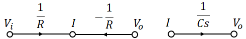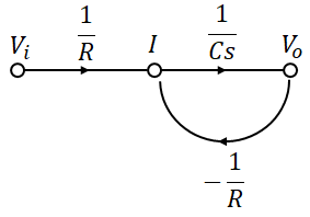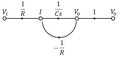 69. 그림과 같은 RC 회로에서 전압 vi(t)를 입력으로 하고 전압 vo(t)를 출력으로 할 때 이에 맞는 신호 흐름 선도는?(단, 전달함수의 초기값은 0)