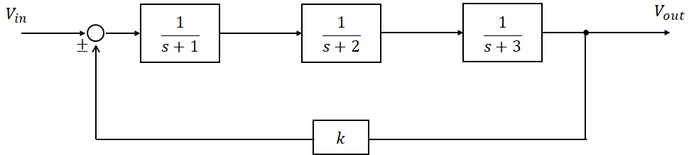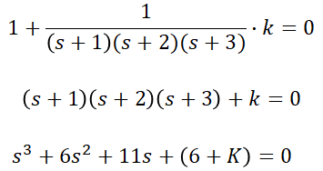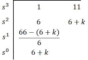 여기서 제 1열의 부호 변화가 없어야 하므로, 66-(6+k)>0, 6-k>0이 되어야 합니다. 따라서 k<60, -6>k이므로 둘을 합하면, -6<k<60의 범위에서 위의 시스템이 안정하다는 것을 알 수 있습니다.
