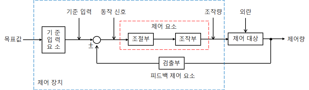 제어 요소는 동작 신호를 조작량으로 변환하는 요소로 조절부와 조작부로 이루어져 있으며, 폐루프 제어계의 구성도를 보면 다음과 같습니다.