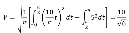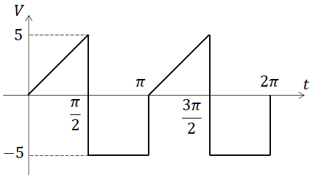 주기는 π이고, π/2까지는 함수가 (10/π)t, π/2에서 π까지는 -5이므로 대입하면,