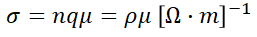 여기서 n은 단위체적당 전하의 수, q는 한 개 입자의 전하량[C], μ는 하전입자의 이동도, ρ는 체적전하밀도 [C/m^2]이므로, 도전율은 전하밀도와 이동도에 비례한다는 것을 알 수 있습니다.