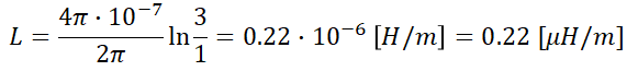 17. 내경의 반지름이 1[mm], 외경의 반지름이 3[mm]인 동축 케이블의 단위 길이 당 인덕턴스는?(단, μr=1, 내부인덕턴스는 무시)