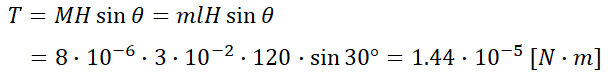 10. 자극의 세기가 8X10^(-6) [Wb], 길이가 3[cm]인 막대자석을 120[AT/m]의 평등 자계 내에 자력선과 30º의 각도로 놓으면 이 막대자석이 받는 회전력은?