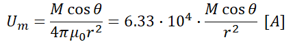 12. 자기 쌍극자에 의한 자위 U[A]에 해당되는 것은?(단, 자기 쌍극자의 자기 모멘트는 M[Wb·m], 쌍극자의 중심으로부터 거리는 r[m], 쌍극자의 ㅈ어방향과의 각도는 θ)