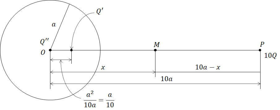 가 됩니다. 여기서 구도체에 준 전하 -Q는 영상전하 Q''=Q와 중화되기 때문에 점 P의 10Q와 영상전하 Q'=-Q에 의한 전위 VM=0조건에 의해,