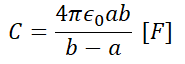 동심 구형 콘덴서의 정전용량은 다음과 같습니다.