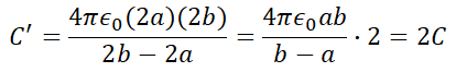 내구와 외구의 반지름을 각각 2배로 늘린 정전 용량을 C'라 하면,