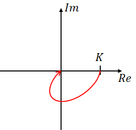 이러한 형태의 전달함수의 경우 벡터궤적은 분모항의 갯수에 따라 달라지게 됩니다. 만약 분모항이 1+T1s만 존재하면 K에서 출발해 바로 0으로 가게 될 것입니다.