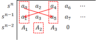 s^n항의 계수가 a0였으므로 a0부터 쓰고, 이후 한 칸씩 건너뛰며 a2, a4, a6을 작성합니다. 같은 방법으로 s^(n-1)항의 계수가 a1이므로 역시 한 칸씩 건너뛰며 a3, a5, a7을 작성합니다. 이렇게 작성하고 s^(n-1)밑에 s^(n-2)항의 계수부터는 이 두 줄의 원소들을 통해 계산을 해야 합니다.