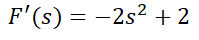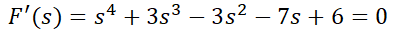 이렇게 나타나게 됩니다. s차항의 원소들이 모두 0이므로 첫째열의 부호 변화를 판별할 수가 없습니다. 따라서 바로 윗 행 원소의 계수값으로 다음과 같이 보조방정식을 세워야 합니다. 이 새로운 보조방정식을 F'(s)라 하면, 루스표 규칙에 의해 다음과 같이 쓸 수 있습니다.