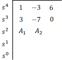 가 되어 윗 행과 원소 부호가 변하므로 이 제어계는 불안정하다는 것을 알 수 있습니다. 연습을 위해 모든 루스표를 체워보면,
