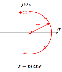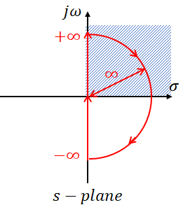 의 경로로 사상하는 것입니다. 즉, 우반부 전체를 포함해 회전하는 것입니다. 그렇다면 결국, F(s)평면상에 우리가 그리고 싶은 그림은 F(s)의 변수인 s의 실수부가 0일 때, jw가가 음의 무한대에서 0, 0에서 무한대로 이동하고, 이후 크기는 무한대인 반원을 그리는 경로를 따라 움직이는 F(s)값들입니다.