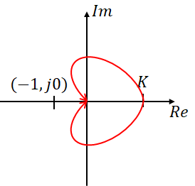 그러나 우리가 궁금한건 F(s)=1+G(s)H(s)로 이 모든 값들에 대해 1이 추가된 값입니다. 간단하게 원래의 전달함수의 s에 0과 무한대를 대입해보면, 시작점과 끝점이 각각 K+1, 1이 된다는 사실을 알 수 있습니다. 따라서 구하고자 하는 나이퀴스트 선도는 다음과 같습니다.