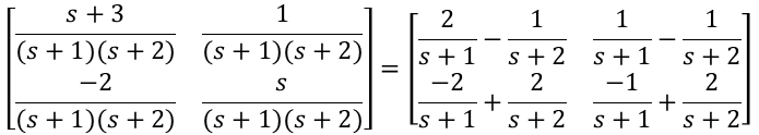 이 행렬을 역 라플라스변환해야 하므로 정리하면,