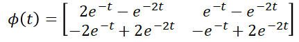 위 식에 대입해보면 적절한 해 임을 알 수 있습니다. 따라서 우리는 이로부터 상태천이행렬을 다음과 같이 쓸 수 있습니다.