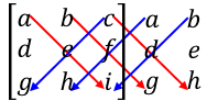 그런 다음 a부터 시작해 c까지는 오른쪽 대각선 아래로 곱해서 더해주고, 다시 c부터 시작해 왼쪽 대각선 아래로 곱해서 빼줍니다.