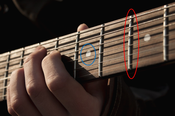 넥은 이렇게 지판이 있는 부분을 말합니다. 위의 빨간색으로 표시한 부분을 프렛이라고 하는데 저 프렛 사이를 누르게 되면 프렛에 줄이 닿게되고, 그럼 줄을 치게 되었을 때 프렛으로부터 바디의 브릿지까지 만큼의 줄 길이 만큼 소리가 나게 되는 것입니다. 이 부분에 대해서는 기타가 있으신 분들은 직접 눌러보면서 알 수 있을 것이고, 아직 기타가 없으신 분들은 구매해서 한 번 만져보면 알 수 있을 것입니다. 여튼 이 프렛과 프렛으로 지판이 구분되어 있어서 필요한 부분을 운지하면 필요한 소리를 낼 수 있습니다.