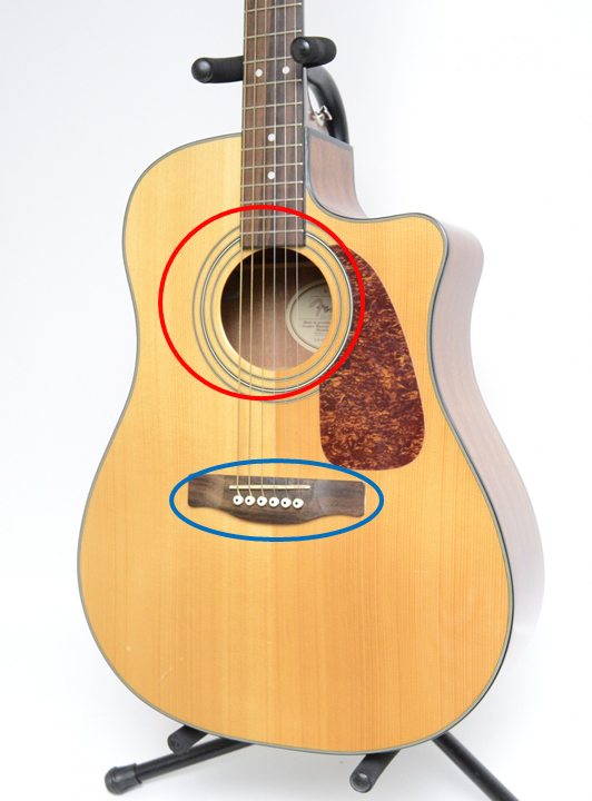 바디는 바로 이 부분을 말합니다. 빨간 원 부분은 위 그림과 같이 어쿠스틱 기타의 소리가 더욱 풍성하게 울릴 수 있도록 만들어 주는 울림구멍입니다. 전자기타의 경우는 픽업이라는 장치를 통해 줄의 소리가 앰프를 통해 나올 수 있게 만들어주죠.