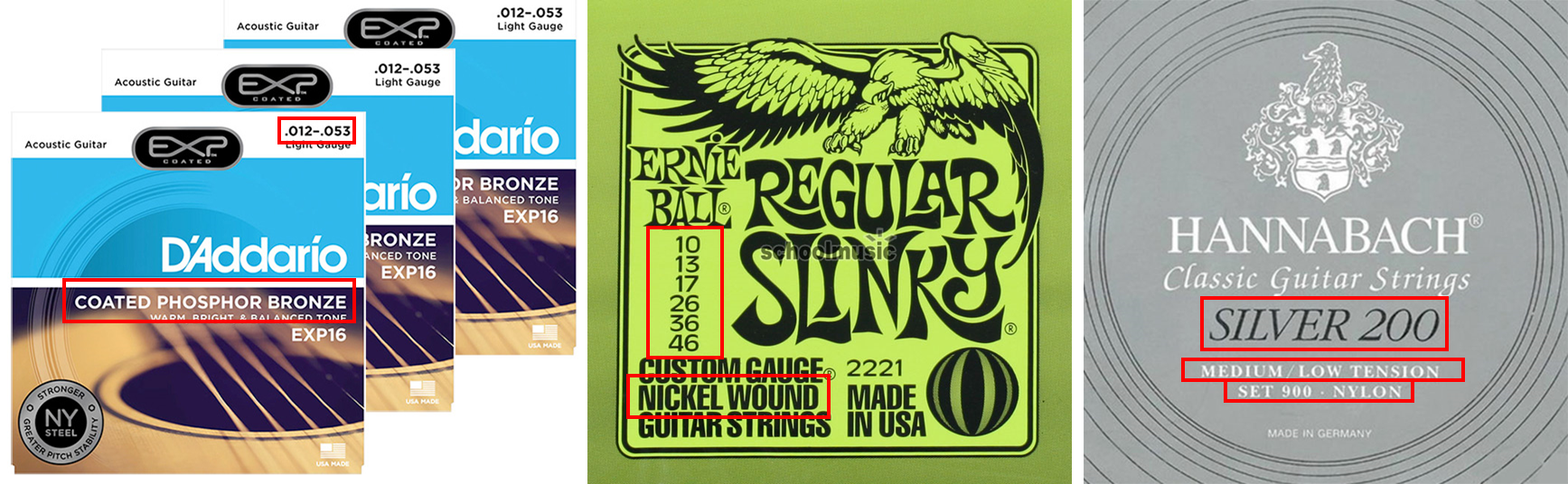 일렉 기타역시 똑같습니다. 가운데 일렉 기타 줄의 포장지를 보면 세로로 숫자들이 죽 써져있는 것을 볼 수 있습니다. 가장 위의 10의 의미가 1번줄의 두께가 0.010 게이지라는 뜻입니다. 그 밑의 숫자들은 역시 2번줄에서 6번줄의 두께를 말하고 있는 것입니다.