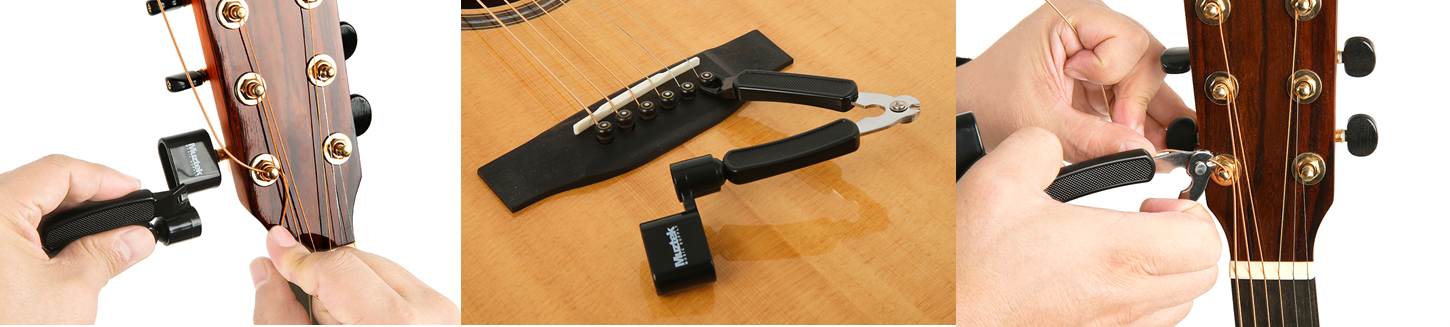 그런 불편함을 줄이기 위해 페그에 걸어 줄 감는 것을 도와주는 장비가 이 와인더입니다. 와인더만 있는 제품도 있지만 위 제품처럼 올인원 제품으로 통기타의 브릿지 핀을 뽑는 용도의 노루발 같이 생긴 부분과 자투리 줄을 자를 수 있는 커터가 함께 있는 제품이 있습니다.