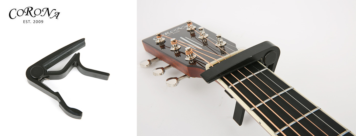 마지막으로 카포입니다. 카포는 위의 그림처럼 한 플렛의 줄을 잡아주는 역할을 합니다. 이렇게 한 플렛을 잡아주게 되면 원래의 튜닝에서 전체적으로 잡아준 플렛만큼의 음을 높여서 튜닝한 것과 같은 효과를 내는 것이죠.