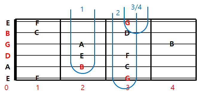 타브를 보는 것과 같은 방법으로 보면 되고, 손가락 번호도 표시되었어서 보면 이해가 되실거라 생각합니다.