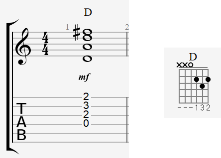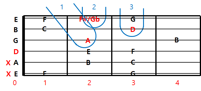 D 메이저 코드도 C 메이저 코드처럼 5번줄과 6번줄은 치지 않습니다. 근음인 D가 4번줄 개방현이고, 이 음보다 더 낮은 D가 없기 때문에 스트로크할때 5번줄과 6번줄을 치지 않도록 주의하기 바랍니다.