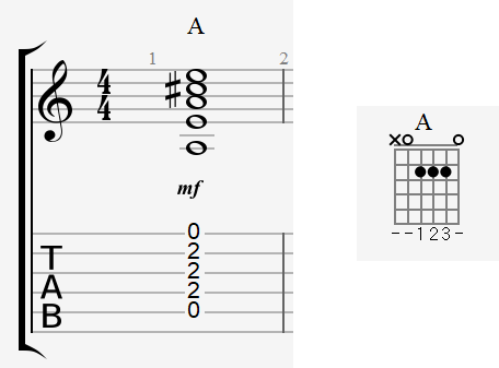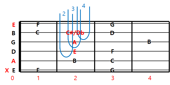 4번줄부터 순서대로 1, 2, 3번 손가락을 이용해 잡아도 크게 상관은 없으니 여러가지로 연습해보는 것도 많은 도움 될것입니다. A 메이저 코드도 근음 A가 5번줄 개방현에 있기 때문에 6번줄은 빼고 스트로크 해주셔야 합니다.