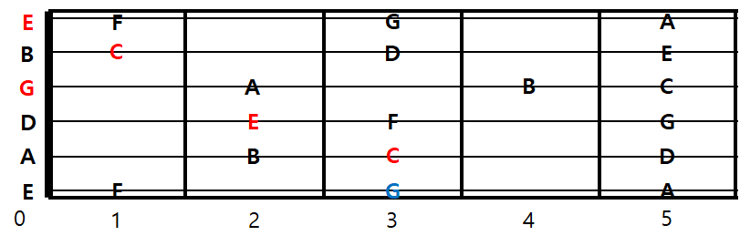 C 메이저 코드의 구성음이 C E G 라는 것을 알았으니 그럼 지판에서 한 번 살펴보도록 하겠습니다.