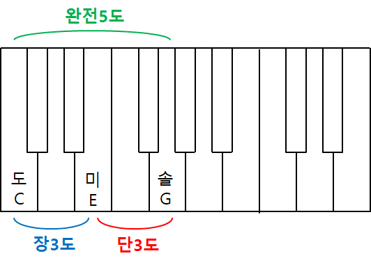 그래도 이정도로만 기억해두세요. 코드는 기준음인 근음에 잘 어울리는 음을 쌓은 것인데, 먼저 장3도음을 쌓아 올리고 그 음으로부터 다시 단3도음을 쌓아 올린것이다. 이 세번째음은 근음으로부터 완전5도이다. 이렇게요. 그래도 말씀드리자면 장3도는 온음 2개 만큼의 차이가 나는 음이고, 단3도는 하나의 온음과 하나의 반음, 완전5도는 3개의 온음과 하나의 반음이 차이가 나는 음입니다.