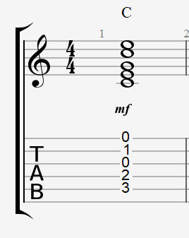 이렇게 되겠네요. 그런데 잘 보면, 6번줄 3번 프렛이 G음으로 C 메이저 코드의 구성음이지만 가장 낮은 C인 5번줄 3번 프렛보다도 더 낮은음입니다. 이렇게 근음보다 낮은 음은 사용하지 않습니다. 만약 사용하게 되면 다른 이름으로 불리게 되구요. 그래서 C 메이저 코드는 다음과 같이 잡고 연주하면 됩니다.