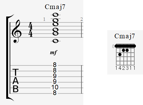3번 또는 4번 손가락으로 누르는 1번줄에 8도음이 있으니 한 프렛 내려서 메이저 세븐스 코드를 완성해봅시다.