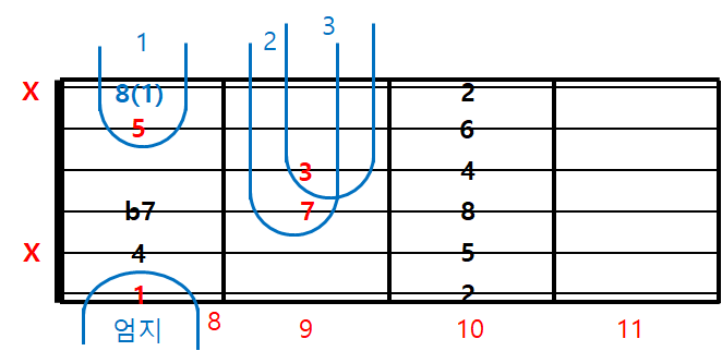 이렇게 1 - 7 - 3 - 5의 구성으로도 잡을 수 있죠. 역시 필요없는 음인 4번줄과 6번줄은 뮤트하도록 주의해서 연주하면 됩니다.