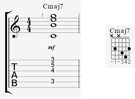 이어서 메이저 세븐스 코드(Major 7th Chord)입니다. 역시 하이코드에서 메이저 세븐스 코드의 모양과 개방현으로 연주하는 코드에서 모양을 알아보겠습니다.