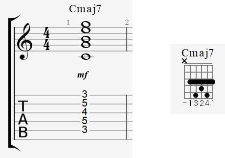 이렇게 1 - 7 - 3 - 5의 구성으로 메이저 세븐스 코드를 잡기도 합니다. 6번줄은 엄지손가락으로, 나머지 음들을 1, 2, 3번 손가락을 이용해 잡기도 합니다.