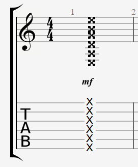 X 표시가 된 줄을 왼손으로 프렛을 완전히 누르지 않고 살짝만 대고 피킹 또는 스트로크하여 줄이 틱틱 걸리는 소리를 내라는 뜻입니다. 그런데 보통 이렇게는 사용하지 않고 아래처럼 사용하죠.