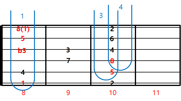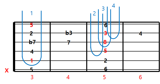 2번 손가락을 이용해서 7도음을 잡아주며 1 - 5 - 7 - b3으로 구성된 코드를 완성하였습니다.