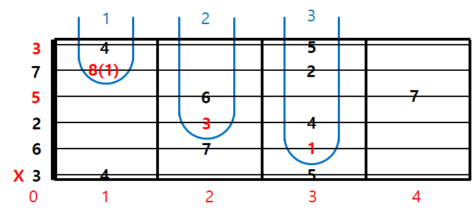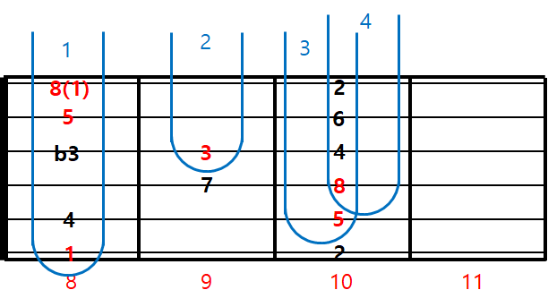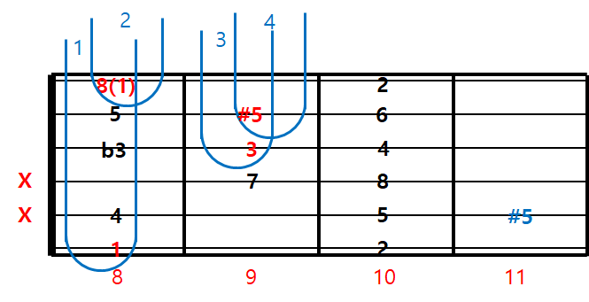 먼저 6도음까지 누르기엔 복잡하니 1 - b3 - b5음을 이용해 잡아보면 이렇게 잡을 수 있습니다.