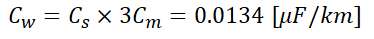 Ex.2) 다음과 같은 60 [Hz], 154 [kV], 길이 200 [km]인 3상 송전 선로에서 Cs=0.008 [μF/km], Cm=0.0018 [μF/km]일때 1선에 흐르는 충전 전류 [A]는?