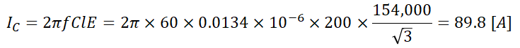 Ex.1) 정전 용량 0.01 [μF/km], 길이 173.2 [km], 선간 전압 60000 [V], 주파수 60 [Hz]인 송전선로의 충전전류는 몇 [A]인가?