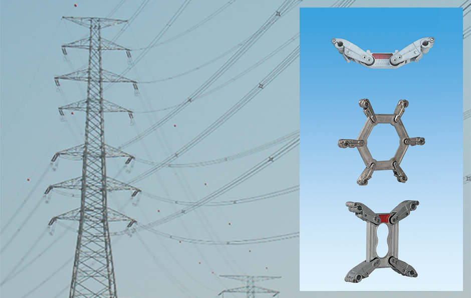 오른쪽의 스페이서를 보면 위에서부터 복도체, 6도체, 4도체에 사용되는 스페이서입니다. 또 왼쪽을 보면 이렇게 송전탑에 스페이서를 사용해 다도체 방식으로 전력을 공급하고 있음을 알 수 있습니다. 참고로 복도체는 송전전압 154kV 라인에, 4도체는 345kV, 6도체는 765kV 라인에 사용합니다.