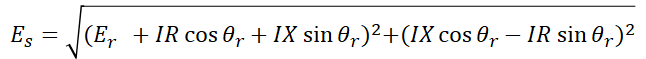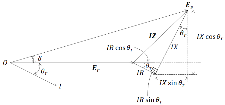 위의 수전단 전압인 Er을 기준으로 그린 벡터도를 보면 송전단 전압은 수전단 전압과 저항과 임피던스의 전압강하의 합과 같다는 것을 알 수 있습니다.