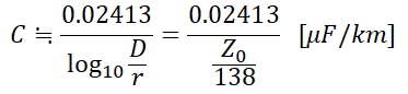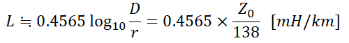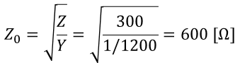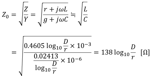 위에서 구한 특성 임피던스를 우리가 앞서 선로정수에서 구한 작용 인덕턴스와 정전용량을 대입해보면 다음과 같습니다.