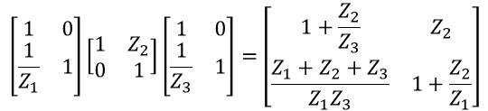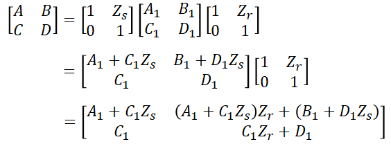 4단자 정수 양 옆으로 임피던스가 직렬로 연결되어 있으므로 다음과 같이 합성 4단자 정수를 구할 수 있습니다.