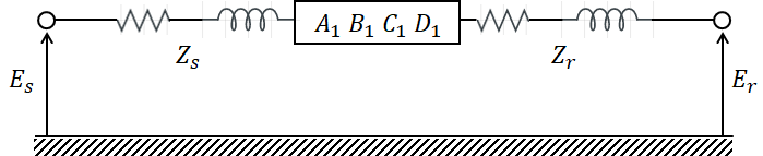 ex.1) 그림과 같이 4단자 정수가 A1, B1, C1, D1인 송전선로의 양단에 Zs, Zr의 임피던스를 갖는 변압기가 연결된 경우 합성 4단자 정수 중 A의 값은?
