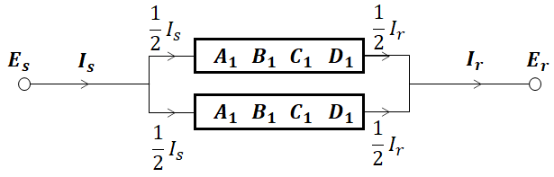 그리고 2회선 송전선로에 대해선 전체 4단자 정수를 A, B, C, D라고 했을 때, 다음과 같이 쓸 수 있습니다.