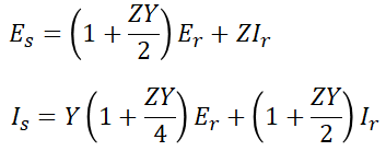 따라서 4단자 정수의 기본식에 대입하면 송전 전압과 송전 전류는 다음과 같이 구할 수 있습니다.
