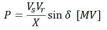 Vs, Vr은 각각 송, 수전단 전압(kV), δ는 송수전단 전압의 위상차, X는 선로의 리액턴스를 의미합니다.