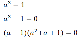 복잡해 보이지만 간단하게 a는 반시계 방향으로 120º 회전한 것을 의미합니다. a제곱의 경우 반시계로 120º도 두 번 회전한 것으로 반시계 방향 240º 회전 또는 시계방향 120º 회전한 것을 의미합니다. 그러니 a세제곱의 경우 자기 자리로 돌아오니 그대로 1이 되는 것입니다. 그 뒤의 식 같은 경우엔 다음을 통해 구할 수 있습니다.