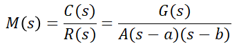 먼저 한 가지 가정이 필요한데, 이 특성방정식 1+G(s)H(s)=A(s-a)(s-b)의 형태로 인수분해가 가능하다고 가정하겠습니다. 간단한 2차함수의 형태를 띄고 있다면 근의 공식을 이용해 위와 같이 인수분해를 하는 것은 크게 어렵지 않을 것입니다. 그렇다면, 전체전달함수 M(s)는 다음과 같이 표현할 수 있습니다.